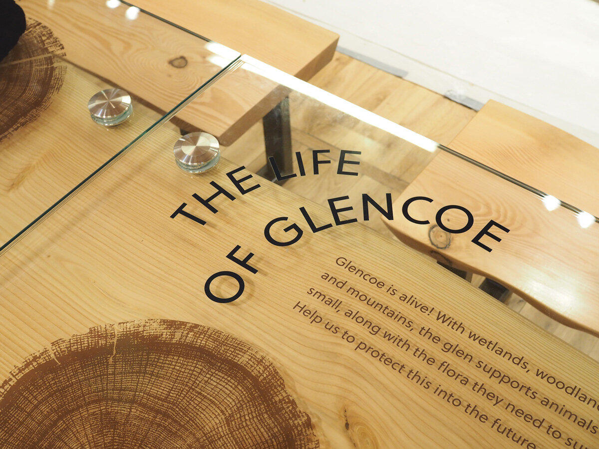 On top of the table sits three panes of glass which have been printed with information about the natural features of the surrounding area of Glencoe.